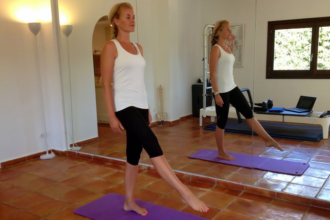 Ibiza Pilates recommends starting with some support, so use a wall to begin with until your balance is good enough to stand without help.