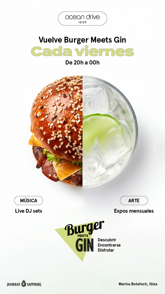 Organizzato dall'Ocean Drive Ibiza, Burger Meets Gin è un evento favoloso che mette insieme hamburger, cocktail eccellenti e musica. Ritorna nella splendida cornice dello Sky Bar, con una vista spettacolare su Dalt Vila, il centro storico di Ibiza Città.