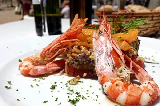 It was a hot day, so my thirsty companion had a fabulous, invigoratingly fresh apple, pear and ginger juice from the juice-bar. We were brought bread, olives and ali-oli to nibble whilst we perused the mouth-watering menu. Bursting with fresh, imaginative Mediterranean dishes, it took my companion and I quite a while to make a decision. We consulted the absolutely charming manageress, Sammi, who confided that Catalan chef, Pep has a real passion for seafood dishes. Insider information! We followed the passion and chose the scallops and baby squid, caught right there on Benirras beach for starters.