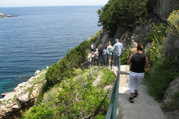 Stepping off the Aquabus cruise at Port De San Miguel ,an Aquabus representative was already waiting for us and he guided us towards us towards a bus which would take us up towards the Can Marca caves, how well organized! Arriving at the Can Marca caves we were greeted by a nice cafe with scenic views over the bay of Port De San Miguel below. A short wait later and we were descending down a scenic walkway towards the entrance of the Can Marca caves.