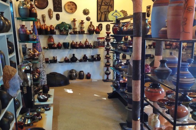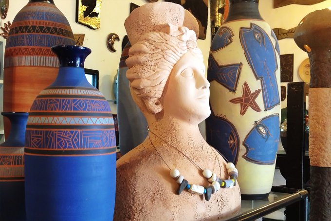 We found ourselves in a kind of hushed awe as we took in the huge variety of items displayed…some shiny, some black, some clay, which Carlos explained all depended on which techniques he used, and it is interesting to note that these techniques have barely altered at all since they were first brought to Ibiza by invaders thousands of years ago. Everything from goblets, to masks, to vases, to jewellery, a lot of influence from the Phoenician era with busts of the goddess, Tanit, in fact the whole ambience of Ceramics Icardi was one of ancient skills brought forward to the modern day.
