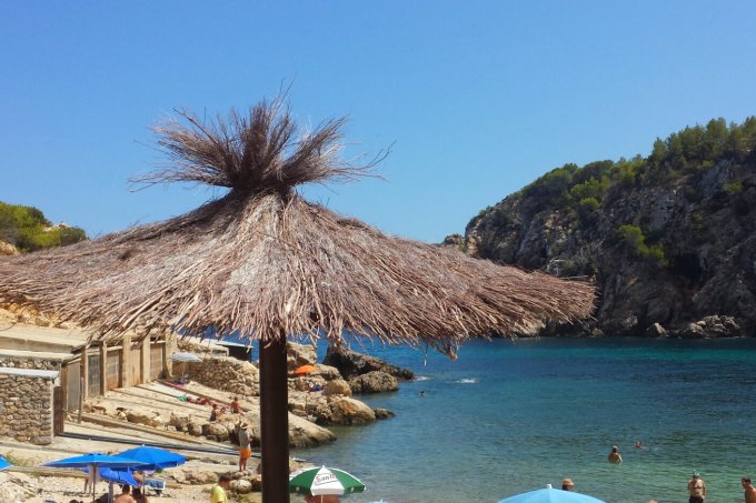 Once at the bottom, welcome to paradise. It's difficult to imagine a more beautiful place on earth to be quite frank. There is one, tiny Ibiza beach bar serving up fresh sea bass, salads and home made burgers. They have only two tables. They will however, serve you at your sunbed, of which there are few and you'll need to arrive quite early to bag one, Ibiza beach connoisseurs!