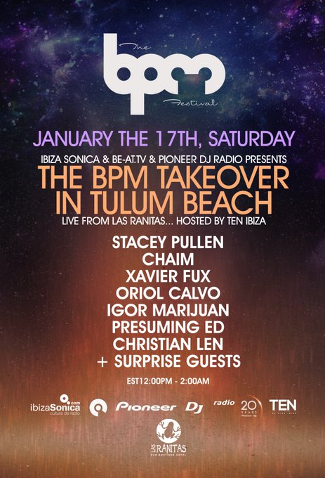 Well, maybe 'little' isn't the right word here. It's surely not the biggest out of all BPM events, but this one looks like a really cool one. On Saturday 17th January Ibiza Sonica Radio are teaming up with TEN Ibiza, the party series made by our fave bar NINE Ibiza. Together with be-at.tv and Pioneer DJ Radio, Sonica and TEN take over the lovely Las Ranitas boutique Hotel in Tulum for a daytime-come-nighttime bash, starting at 12noon.