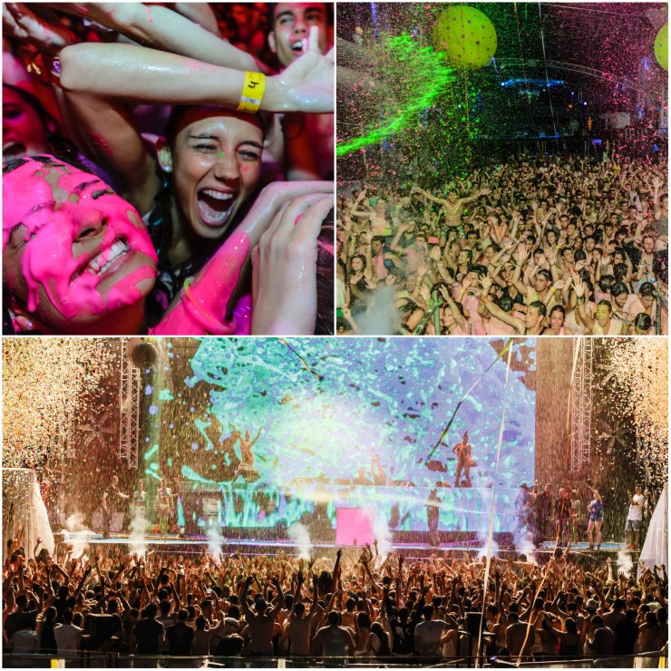 If you’re heading to Ibiza to witness a show, this is a spectacle on a grand scale. LED screens with larger-than-life layered lickings of neon graphics, gorgeous neon-emblazoned dancers, blown-up sumo suit wearing Bez-esque dancers, LED light stilted dancers, aerial acrobats and some sort of gigantic dragon/dinosaur-esque propelled beings – that’s the best description I’ve got on the final observation, if you crack on and check it out for yourself, give me a shout if you have a more accurate one. All of this with periodic releases of smoke machines, confetti, gigantic balloons and of course, the epic paint guns – which as of this year have been pumping out a new formula of odorless, light, and more vibrant stuff than ever before. I had some guy smearing paint on my face from his hair and I can concur, I wasn’t stinkin’ or sticky. Tubes are also offered at five euros a pop in the club for you to create your own damage.
