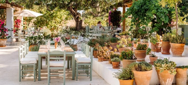 Al di là delle coste assolate dell'isola, c'è una Ibiza diversa, dove gli orti biologici producono il menù del giorno e i pasti vengono consumati su terrazze verdeggianti, sotto pergolati di legno drappeggiati da bouganville.