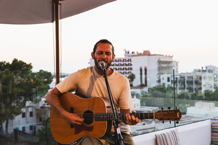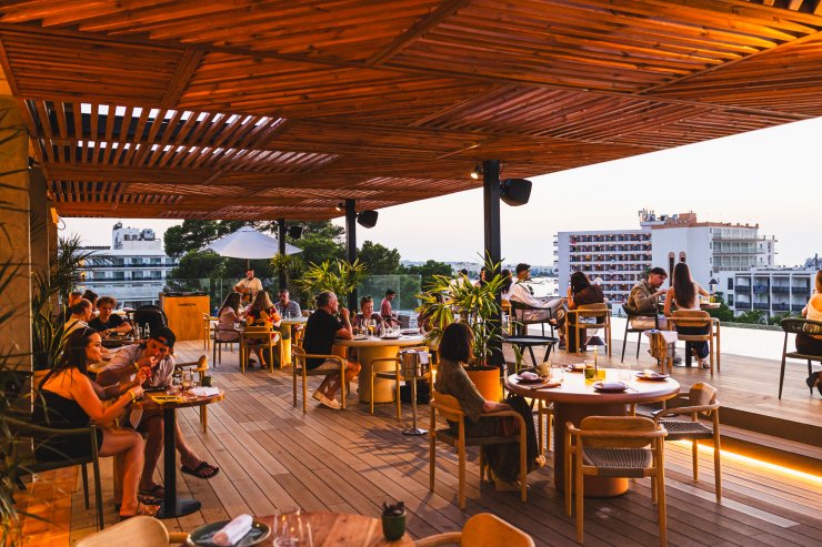 Davanti a te, si intravedono scorci di tramonto sul magnifico skyline di San Antonio, mentre i toni arancioni e viola sfumano verso il blu scuro e le luci scintillanti della seconda località più grande di Ibiza prendono vita. Se guardi con attenzione, puoi sbirciare il movimentato via vai di gente sotto di te – un contrasto evidente con l'ambiente rilassato del rooftop.