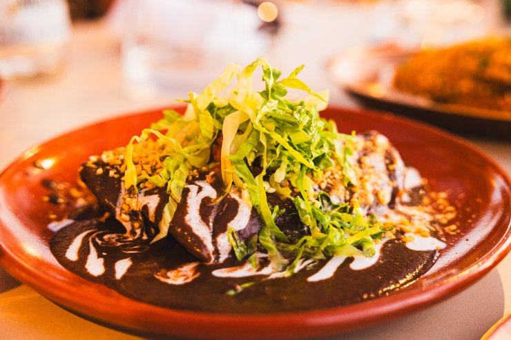 La classica enchilada era piena di pollo e sommersa da salsa mole di fagioli fritti, terrosa, calda e leggermente cremosa. Il peperoncino Guajillo dava alla salsa quel tocco fruttato e affumicato.