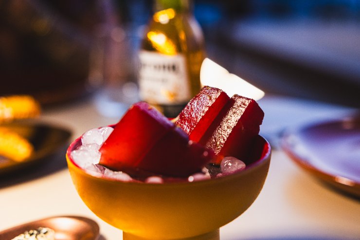 Un intermezzo rinfrescante. Pezzi di anguria dolce, infusi con il mezcal per osmosi, hanno dato vita a un gusto davvero interessante. La dolcezza del frutto è stata esaltata dal classico liquore, con lievi e persistenti note di fumo in sottofondo.