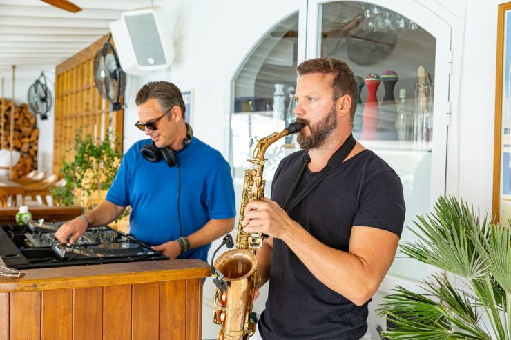 Con DJ Elliot alla consolle, la musica (Balearic Chill, ideale per un pranzo tranquillo in stile mediterraneo) si sposa alla perfezione con l'atmosfera rilassata. Con il passare del tempo e i nostri commensali che si divertono, il ritmo aumenta e lui è accompagnato da un sassofonista.